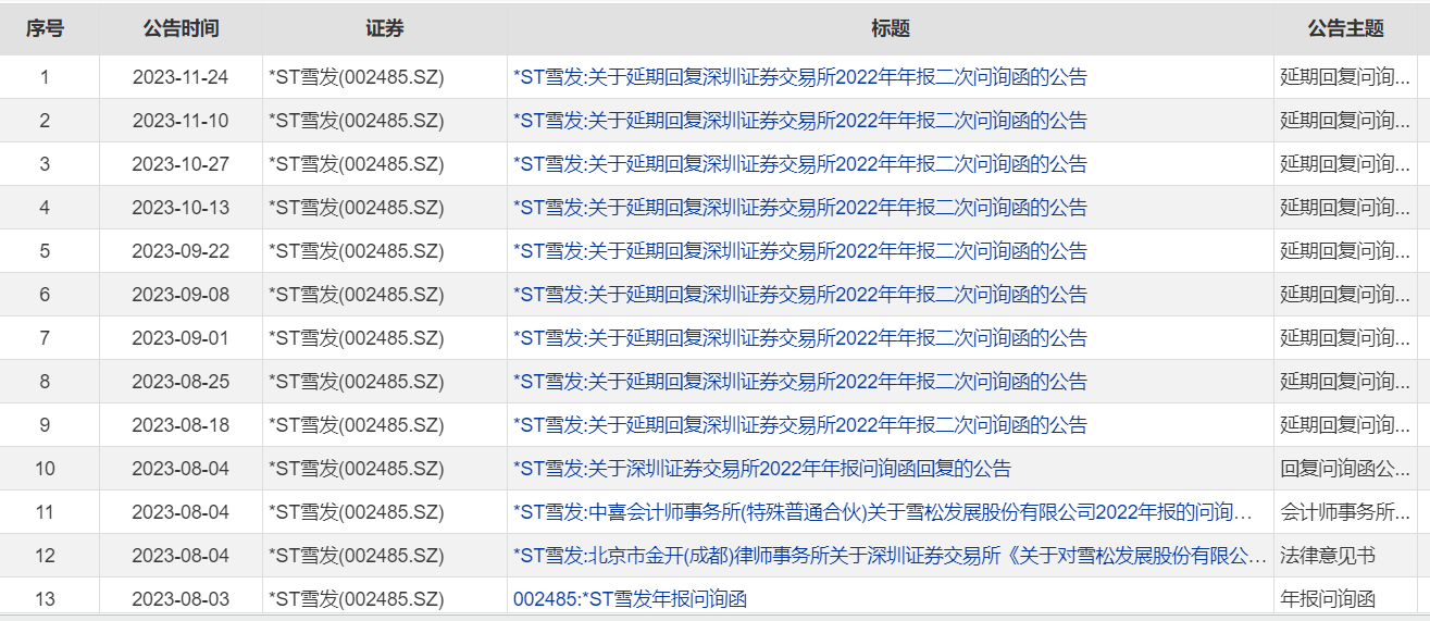 对于该问询函,*ST雪发一再拖延,从2023年的5月一直拖至11月末,至今仍未回复。