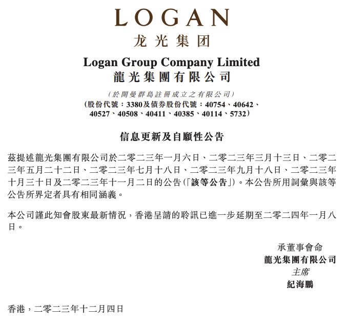 龙光集团12月4日晚间在港交所公告,香港清盘呈请的聆讯已进一步延期至2024年1月8日。
