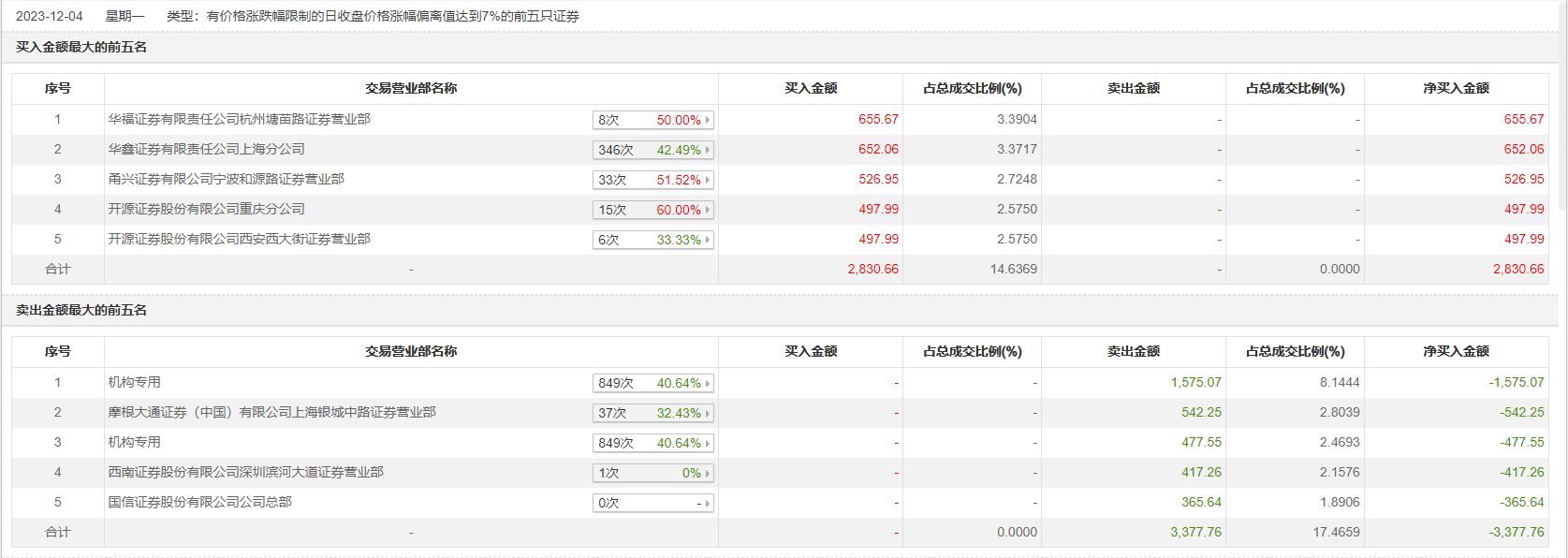 12月4日,北巴传媒今日涨停,全天换手率达5.24%,振幅达10.05%。龙虎榜数据显示,营业部席位合计净卖出547.11万元。其中,机构合计净卖出2052.62万元。此外,华福证券杭州塘苗路证券营业部、华鑫证券上海分公司分别买入655.67万元、652.06万元;摩根大通上海银城中路证券营业部、西南证券深圳滨河大道证券营业部分别卖出542.25万元、417.26万元。