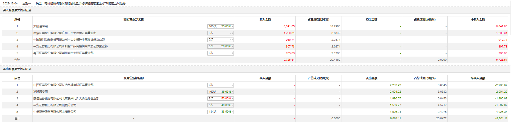 12月4日,通宝能源今日跌8.03%,全天换手率达2.63%,振幅达9.91%。龙虎榜数据显示,营业部席位合计净买入924.41万元。其中,山西证券长治英雄南路证券营业部、沪股通专用分别卖出2263.92万元、2004.22万元;沪股通专用、中信证券广州广州大道中证券营业部分别买入6041.05万元、1200.31万元。