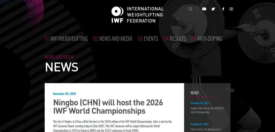 北京时间12月3日晚,在卡塔尔首都多哈举行的国际举重联合会(以下简称“国际举联”)执委会上,宁波突破重围,最终获得2026年世界举重锦标赛举办权。