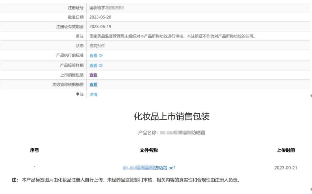 青眼注意到,在国家药监局查询平台,国内外多个美妆品牌于近期上传公示了旗下特殊化妆品的销售包装。例如,国内某品牌防晒类产品在今年6月获批,并于9月上传了产品销售包装。