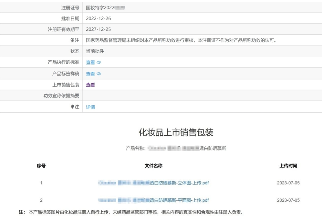 值得一提的是,在化妆品上市包装一栏中,均标注了“本产品标签图片由化妆品注册人自行上传,未经药品监管部门审核,相关内容的真实性和合规性由注册人负责。”无形之中也是在压实企业主体责任,即谁注册谁负责。