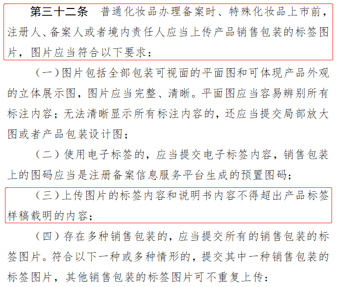 回溯过往。事实上,早在2021年5月,正式实行的《化妆品注册备案资料管理规定》第三十二条就明确要求,普通化妆品办理备案时、特殊化妆品上市前,注册人、备案人或者境内责任人应当上传产品销售包装的标签图片,上传图片的标签内容和说明书内容不得超出产品标签样稿载明的内容,严格规范标签内容。