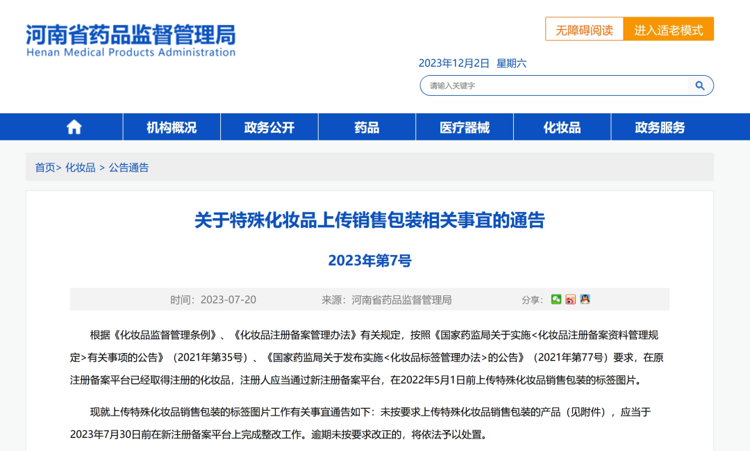 青眼注意到,关于特殊化妆品包装公示,目前已有地方明确出台文件,要求企业限期改正。例如,河南省药监局就于今年7月率先发布《关于特殊化妆品上传销售包装相关事宜的通告》(下称:《通告》)。