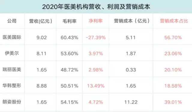 一份来自民生证券的研究报告显示,医美机构的获客营销占比在整个费用结构里达到了30%-35%,一些机构的获客成本甚至高达几千元。正是因为营销费用居高不下,我国的医美机构盈利水平一直处于较低水平。根据《2021年医美行业白皮书》显示,由图可见,2020年,头部医美机构的净利润率在个位数上下。