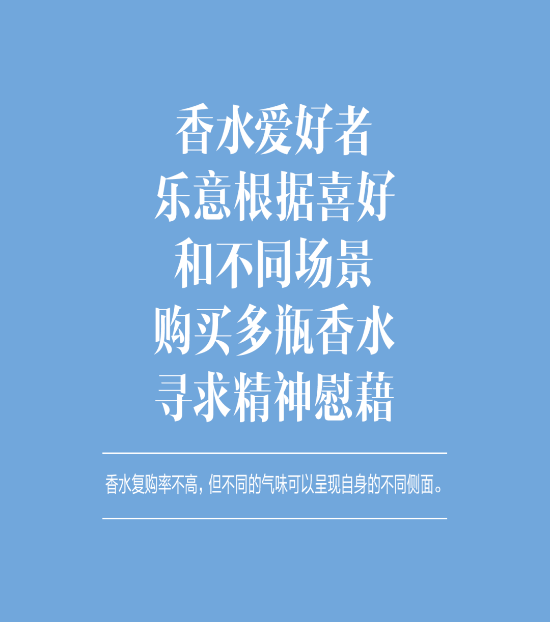 尽管香水这一品类复购率不高,但多数香水爱好者却乐意根据喜好和不同场景购买多瓶香水,从不同的气味中寻求精神慰藉,呈现自身的不同侧面。