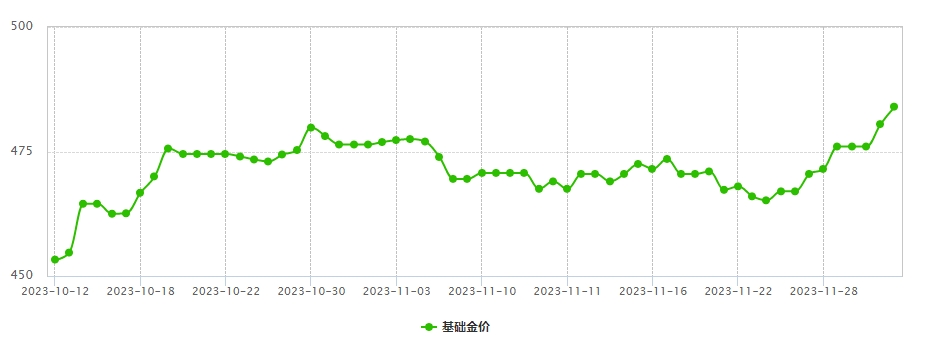 由于国际冲突升级,导致全球对避险资产的需求增加,金价自10月初有所下降后又猛烈走高。10月份至今,国内基础金价从440元/克涨到了480.5元/克,创年内新高。两个月的时间,国内基础金价涨幅近10%。