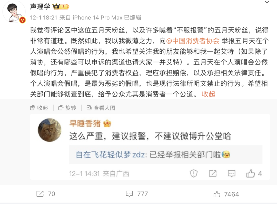 针对这一关键疑问,音乐博主@声理学 在12月1日公开向@中国消费者协会 举报“五月天在个人演唱会公然假唱的行为”。