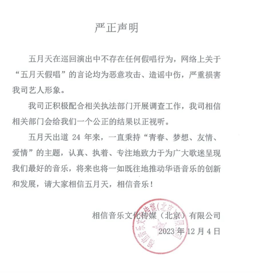 舆论发酵之后,五月天的经纪公司相信音乐在12月4日回复称“没有假唱”。并发布了官方声明,表示“不存在任何假唱行为,正在积极配合相关执法部分开展调查工作。”