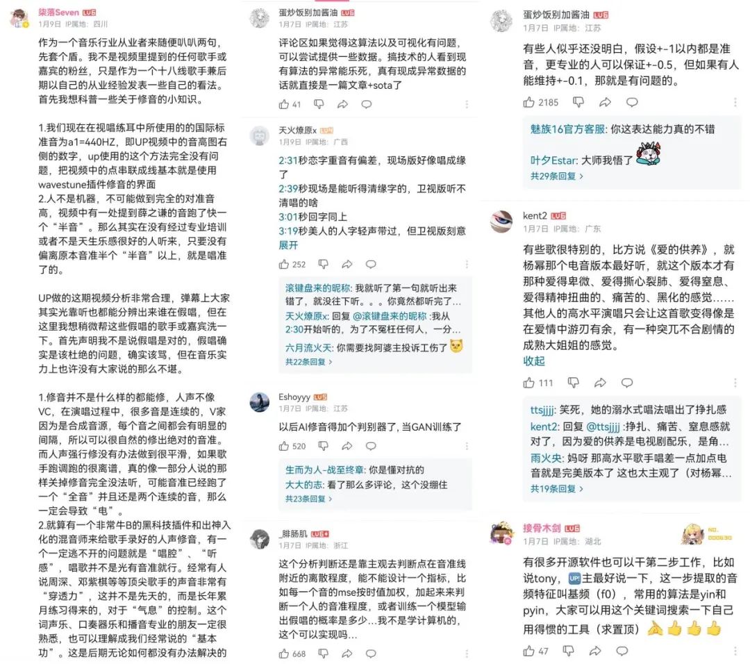 但也有乐评人提出了质疑,认为UP主获取的现场视频音质较低,对于人声的提取有限,关键是“无法判断和声和垫音的程度。”