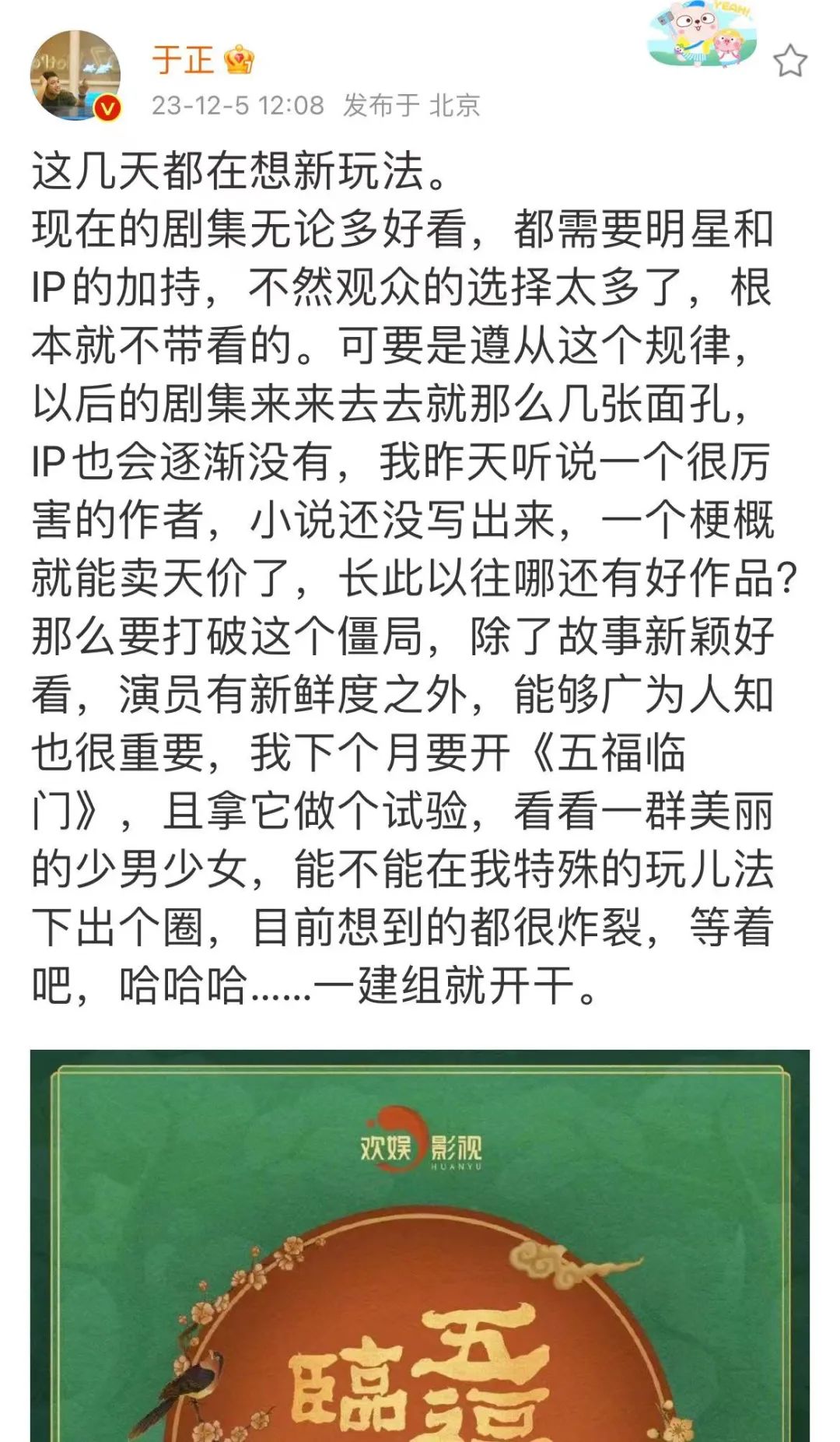 至于前置炒作,于正似乎也痛定思痛,要用“特殊的玩儿法”让新剧《五福临门》“广为人知”,打算“一建组就开干”。