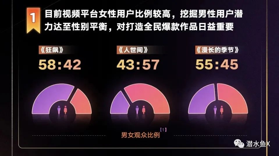 《2023IP风向标》显示,2023Q3爱芒腾优上新独播剧用户女性用户占比在65%-74%之间。而《狂飙》男女性别比例为58:42,《漫长的季节》则为55:45,挖掘男性用户潜力达至性别平衡对打造全民爆款作品日益重要。最近的《似火流年》,作为一部男频剧,观众性别占比更高的反而是女性,达到59.77%。可见,男女频的池子壁垒,确实正在消融。