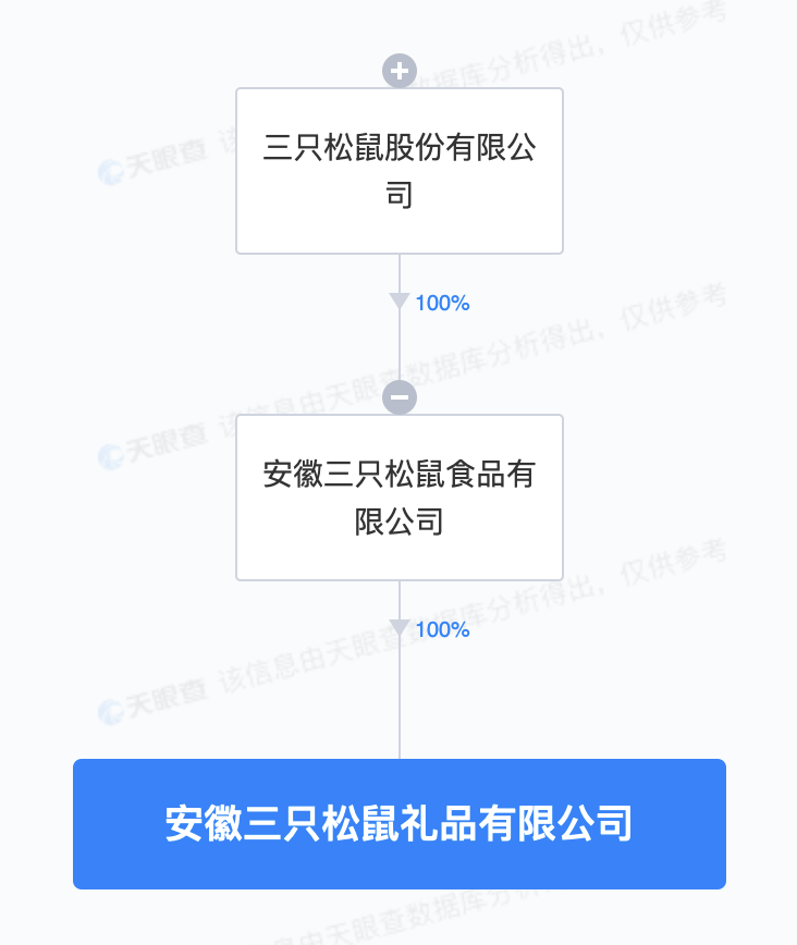 天眼查APP显示,近日,安徽三只松鼠礼品有限公司成立,法定代表人为严秀国,注册资本500万元,经营范围包含:工艺美术品及礼仪用品销售、食品互联网销售、食用农产品零售、品牌管理等。天眼查股权穿透显示,该公司由三只松鼠间接全资持股。