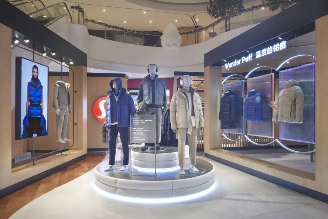 这是lululemon首次使用360度可旋转的科技感裤墙。它不仅能更直观地展示裤装产品,在品牌看来还增加了选购中的趣味性,「男生不都喜欢玩玩具吗。」店员称。
