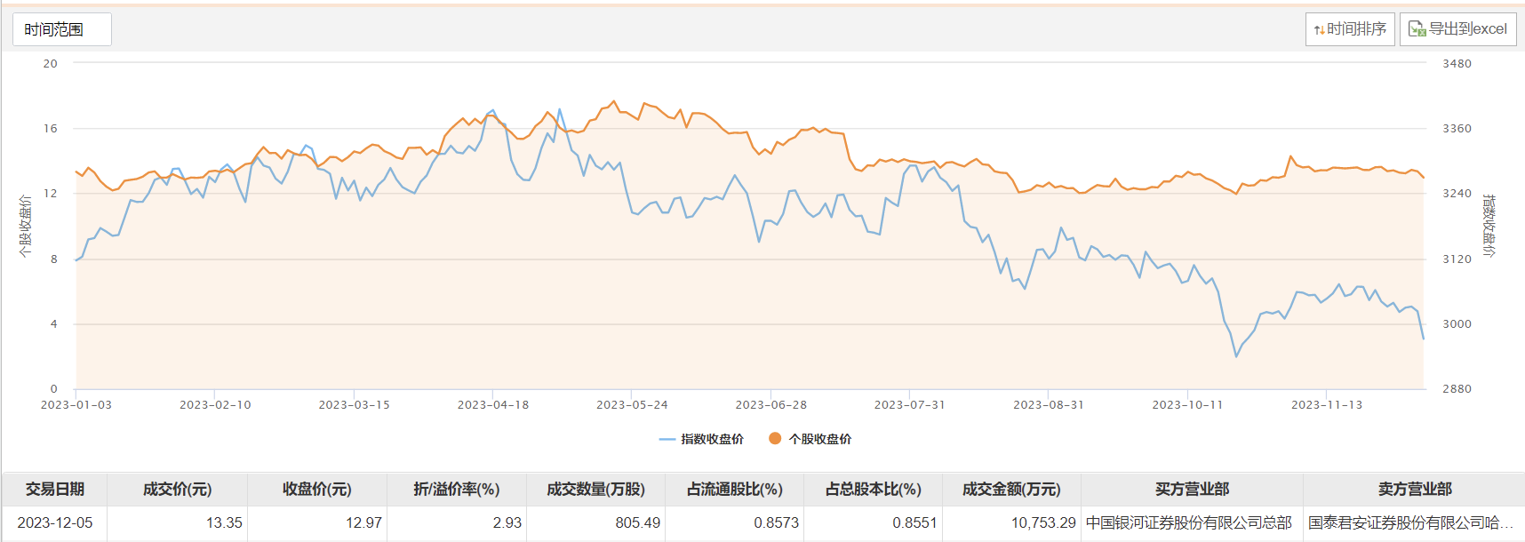 12月5日,珍宝岛今日大宗交易成交805.49万股,成交额1.08亿元,占当日总成交额的58.98%,成交价13.35元,较市场收盘价溢价2.93%。