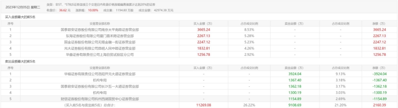 龙虎榜数据显示,12月5日中广天择以“非ST、*ST和S证券连续三个交易日内收盘价格涨幅偏离值累计达到20%的证券”上榜。其中,买入前5名合计净买入11269.08万元,卖出前5名合计净卖出9108.69万元,总合计净买入2160.39万元。在卖出前5名中出现了两个“机构专用”席位,分别净卖出1367.40万元和1300.19万元。