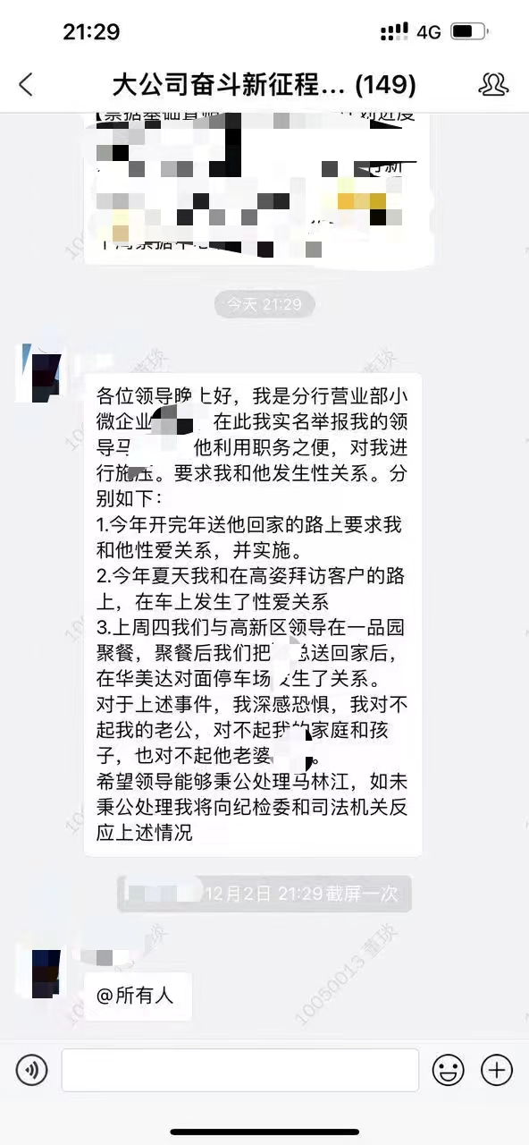 12月5日,一张银行员工举报领导的聊天截图刷屏社交媒体,并登上微博热搜。截图中,该名女员工称被一位领导施压多次发生性关系。自己对此深感恐惧,希望领导能够秉公处理马某。