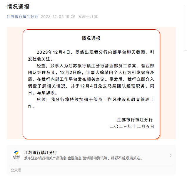 通报称,经查,涉事人为江苏银行镇江分行营业部员工徐某、营业部团队经理马某。12月2日晚,涉事人徐某因个人行为引发家庭矛盾,在该行内部工作平台发布相关言论。事发后,该行立即介入调查了解相关情况,并于12月4日免去马某团队经理职务。同日,马某辞职。
