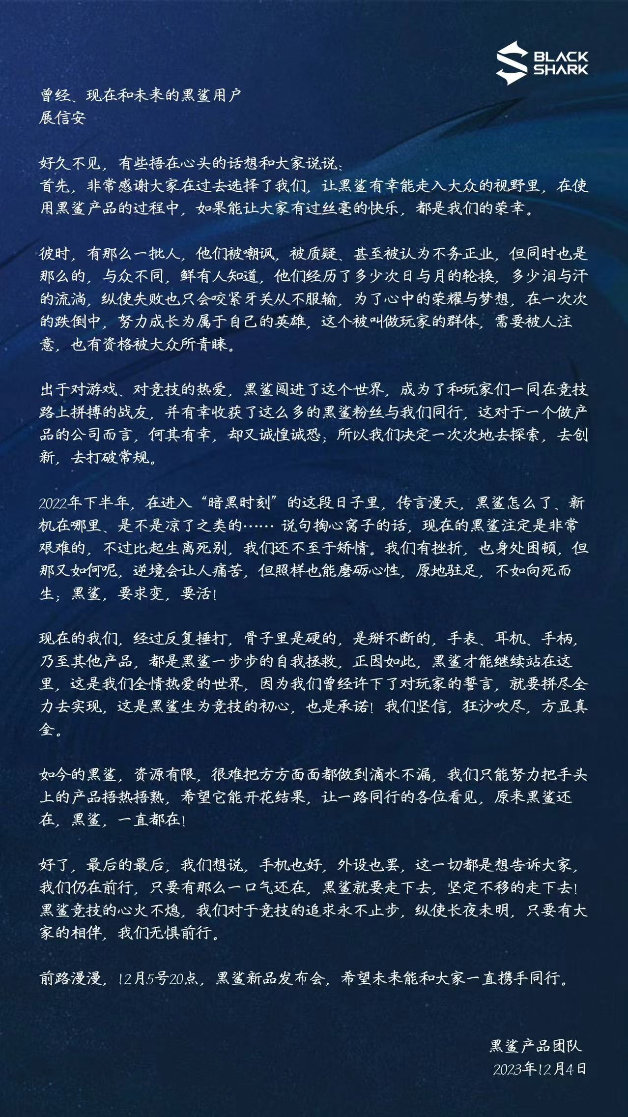 昨日晚间,黑鲨产品团队发布给用户的一封信。信中称,“现在的我们,经过反复捶打,骨子里是硬的,是掰不断的,手表、耳机、手柄乃至其他产品,都是黑鲨一步步的自我拯救”。黑鲨表示,目前资源有限,“只能努力把手头上的产品捂热捂熟,希望它能开花结果”。