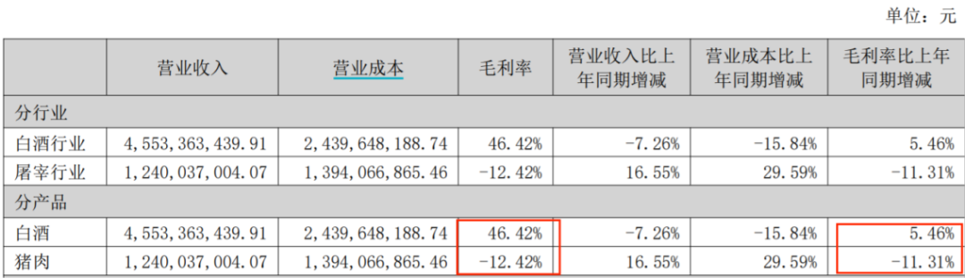 同期,猪肉产品毛利率为-12.42%,同比下滑11.31%;白酒产品的毛利率为46.42%,相比之下,主流白酒公司毛利率位于70%~90%区间,可见顺鑫农业的白酒毛利率偏低。