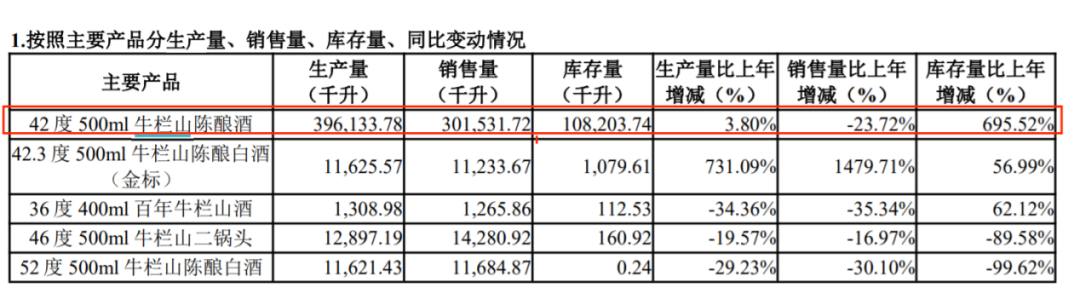 提价后的后果是,2022年,其拳头产品42度500ml牛栏山陈酿酒销售量下滑23.72%,库存大增695.52%。