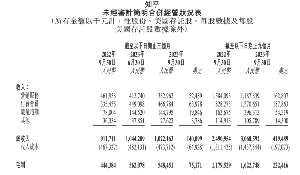 另一个则是职业培训业务。三季度来自职业培训的收入为1.4亿元,同比增长85.6%。根据电话会内容,这部分业务的增长主要得益于在线课程内容的丰富,知乎透露,当下课程链条已经囊括从考研考公到CPA、ESG等考试。