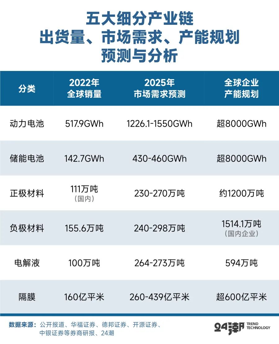首先看24潮产业研究院(TTIR)统计的一组数据:截止目前,在动力电池、储能电池、正极材料、负极材料、电解液与锂电隔膜这6大核心赛道上,已知的企业产能规划均远超2025年第三方研究机构对市场需求的预测上限,未来三年内出现严重产能过剩似乎已经不可避免。