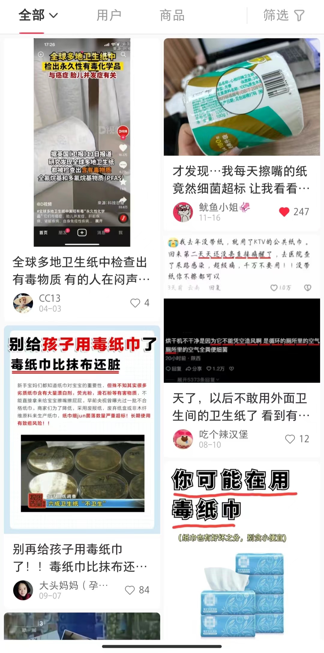 近日,不少网友在社交平台上晒出自己使用“毒纸巾”致病的经历。一些网友称自己在使用公共厕所的纸巾后导致尿路感染、使用餐馆提供的纸巾后嘴唇发炎,更有帖子写到“有报道,一女子长期使用一种零装卫生纸导致感染HPV-16型病毒,纸中细菌含量超标。”