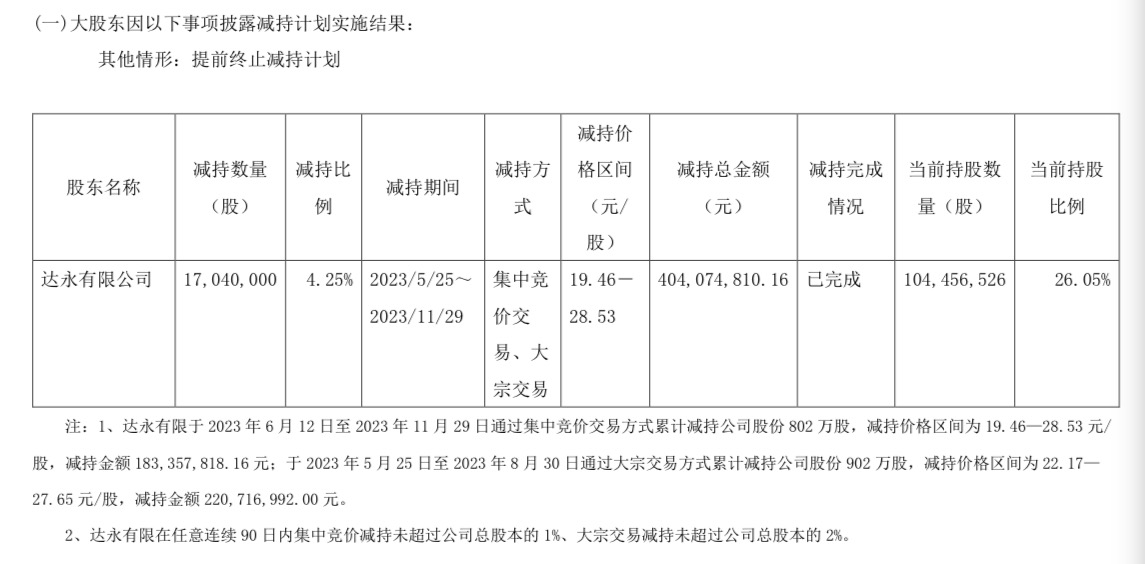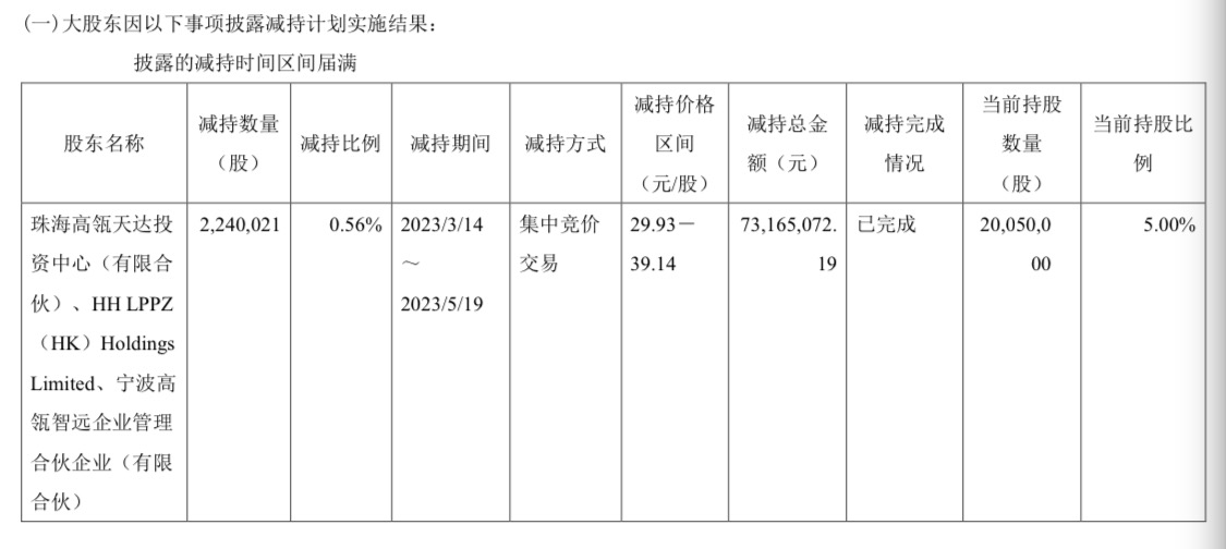 截至去年11月19日,“高瓴系”【珠海高瓴天达投资中心(有限合伙)、HHLPPZ(HK)Holdings Limited、宁波高瓴智远企业管理合伙企业(有限合伙)(其为一致行动人,合称“高瓴系”)】还持有2229万股,占公司总股本的5.56%。