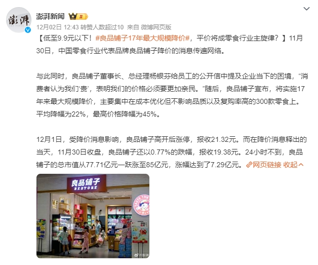 此次降价消息对良品铺子(603719.SH)的股价产生了积极影响。截至12月1日收盘,良品铺子股价报收21.32元/股,较前一个交易日上涨10.01%。好势头还在延续,12月4日,良品铺子再收一个涨停。