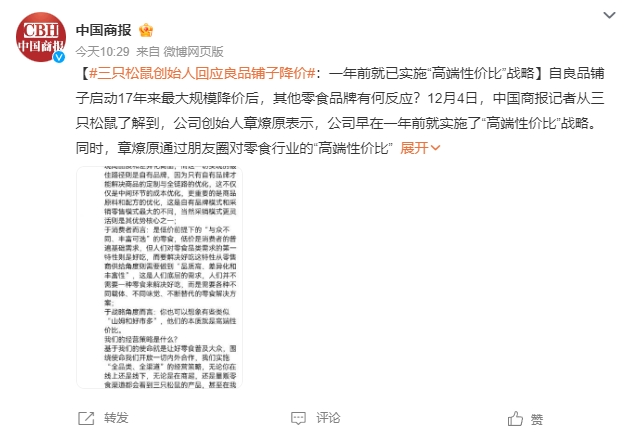 有意思的是,良品铺子降价事件炒的轰轰烈烈之时,三只松鼠也“坐不住了”,其创始人、董事长章燎原在朋友圈发文回应良品铺子降价事项。章燎原表示,公司早在一年前就实施了“高端性价比”战略。