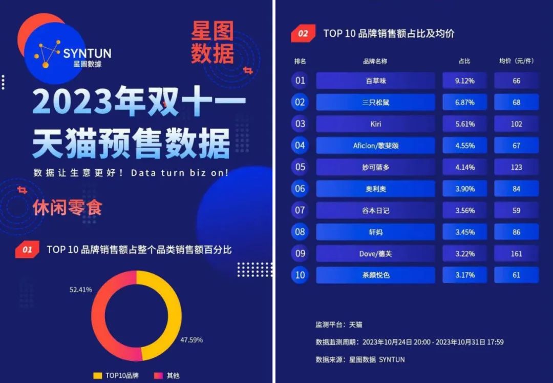 据星图数据发布的2023年双11天猫休闲零食品类预售数据榜单,排名前十品牌销售额总占比达47.59%,相较去年的69.71%下降22.12个百分点。