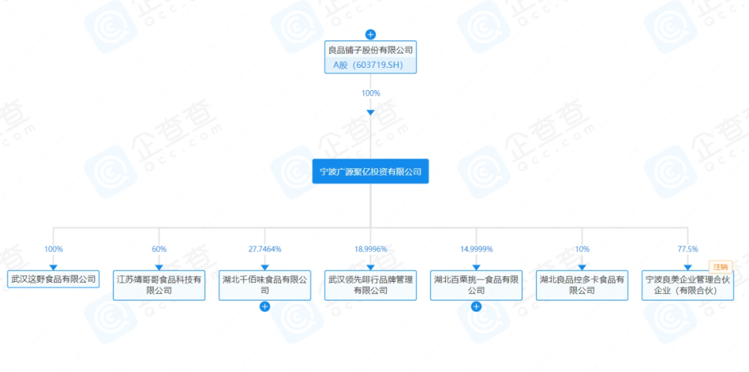 企查查数据显示,“零食顽家”运营公司为湖北千佰味食品有限公司,后者大股东为宁波广源聚亿投资有限公司。这家成立于2021年6月的公司,法定代表人正是杨银芬。可见,为了和零食量贩店竞争,良品铺子已“派出最高指挥官”亲上战场。