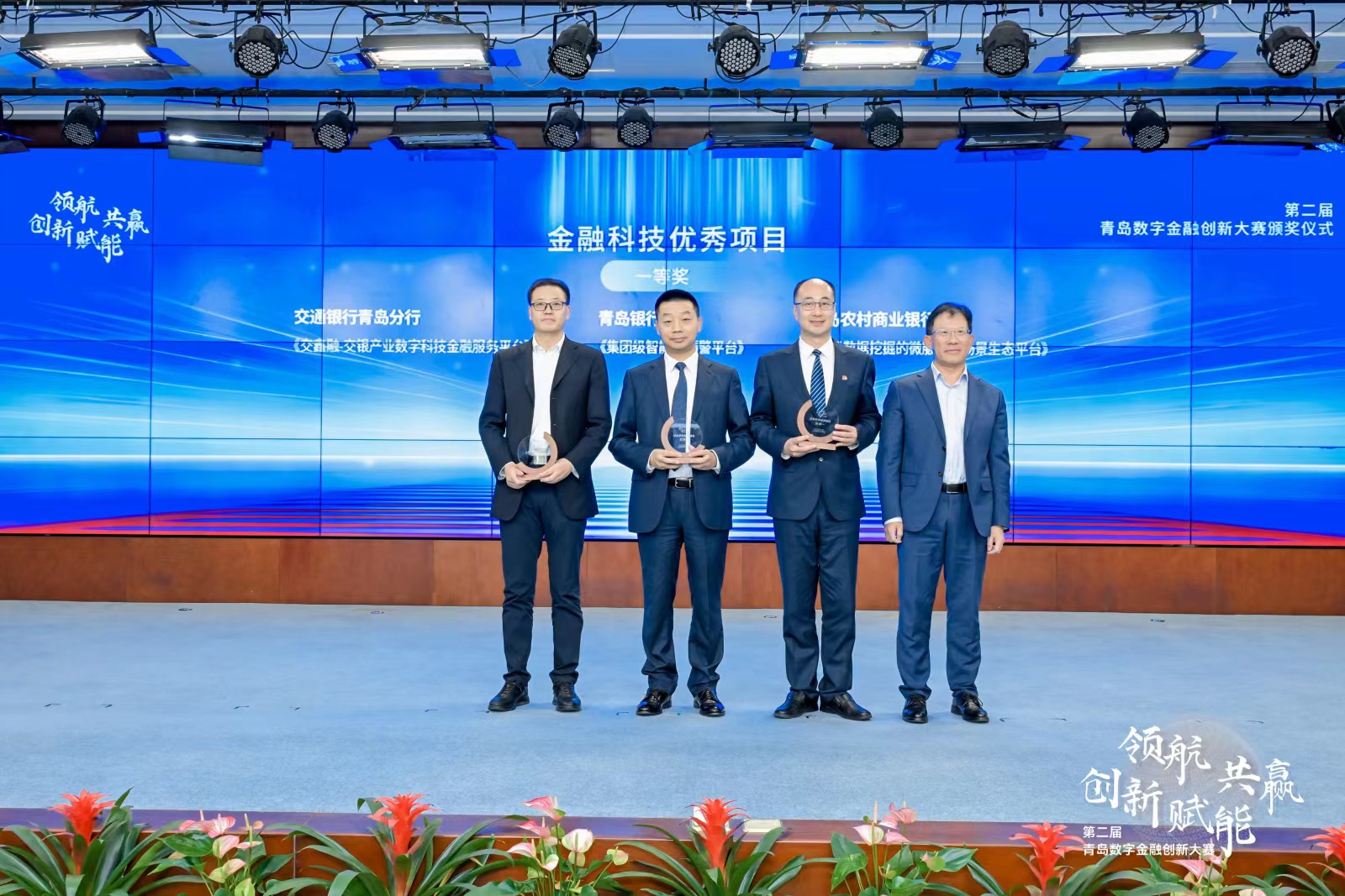 颁奖仪式上,青岛市政府副秘书长陈万胜发表致辞,他表示:“发展数字经济和现代金融无疑是青岛构建现代产业体系的重要环节,将为青岛在全省勇当龙头,在全国进位争先,在世界彰显特色提供坚实支撑。希望各参赛主体能以此次数字金融创新大赛为契机,与金家岭金融聚集区、与青岛市建立紧密合作关系,在金融科技理论研究、标准制定、场景应用、招商引资方面加强沟通交流,实现互利共赢。”青岛金家岭金融聚集区管理委员会副主任董宝华介绍大赛开展情况,并介绍了青岛金家岭金融区在创投风投及企业上市领域的利好政策。与会领导分别为“金融科技优秀项目”及“金融科技揭榜挂帅项目”获奖企业代表颁奖。
