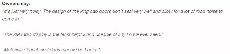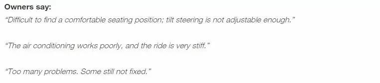 超高分贝的噪音,转向笨拙,以及停车不便,都是车主反感这款车的原因。车主表示,由于座椅不舒服,底盘生硬,所以这款车型极不适合长途驾驶。