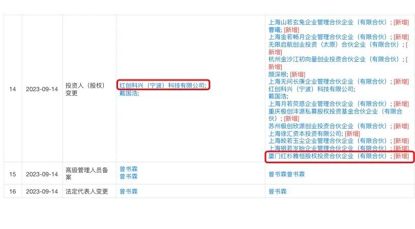 工商变更记录显示,早在今年6月,即无问芯穹创立的第二个月,红杉就通过旗下红创科兴(宁波)科技有限公司(下称:红创科兴),出现在了北京无问芯穹的投资人列表,此次变更为“退出”,或为后续转向上海无问芯穹做准备。