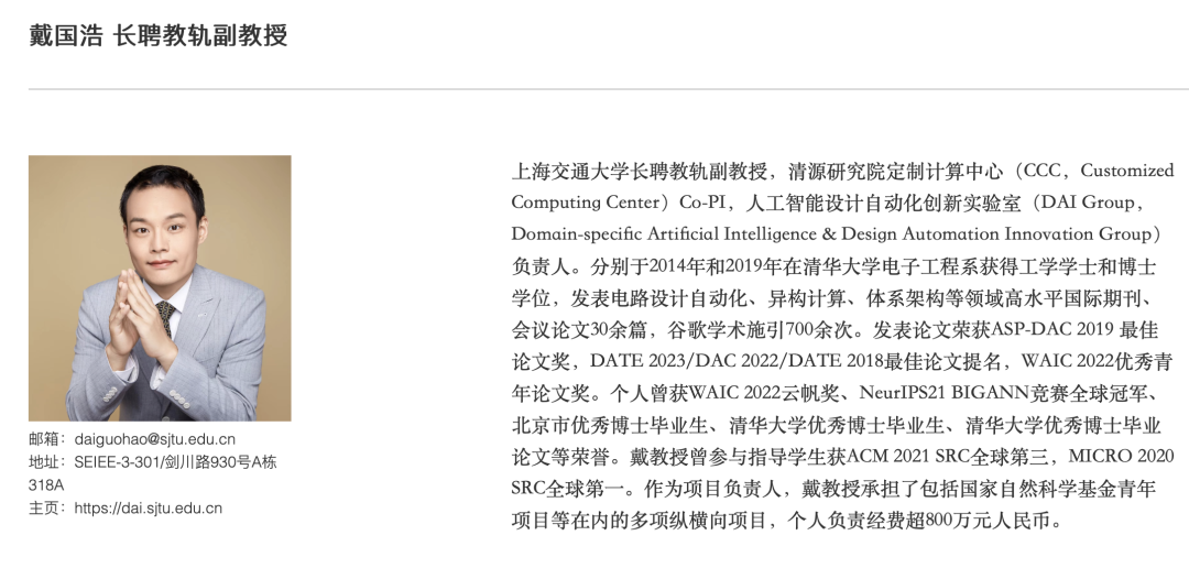 目前,戴国浩是上海交通大学长聘教轨副教授,还是清源研究院定制计算中心共同负责人、人工智能设计自动化创新实验室负责人。