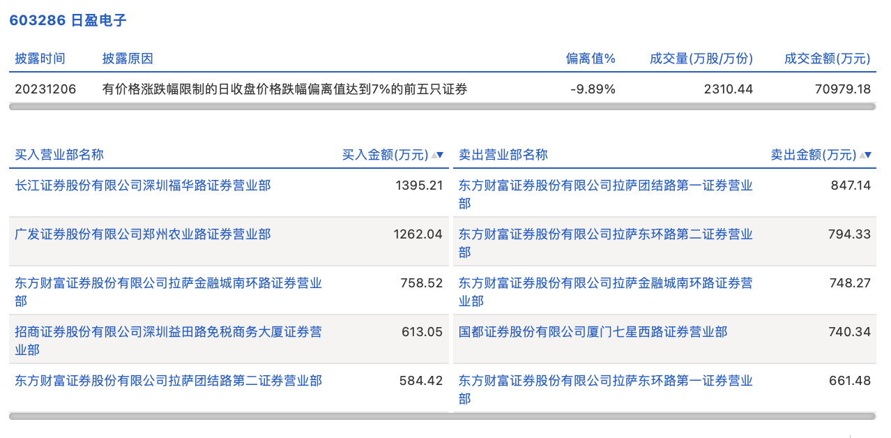 12月6日,日盈电子今日跌停,全天换手率达26.23%,振幅达7.3%。龙虎榜数据显示,营业部席位合计净买入821.67万元。其中,东方财富证券拉萨团结路第一证券营业部、东方财富证券拉萨东环路第二证券营业部分别卖出847.14万元、794.33万元;长江证券深圳福华路证券营业部、广发证券郑州农业路证券营业部分别买入1395.21万元、1262.04万元。