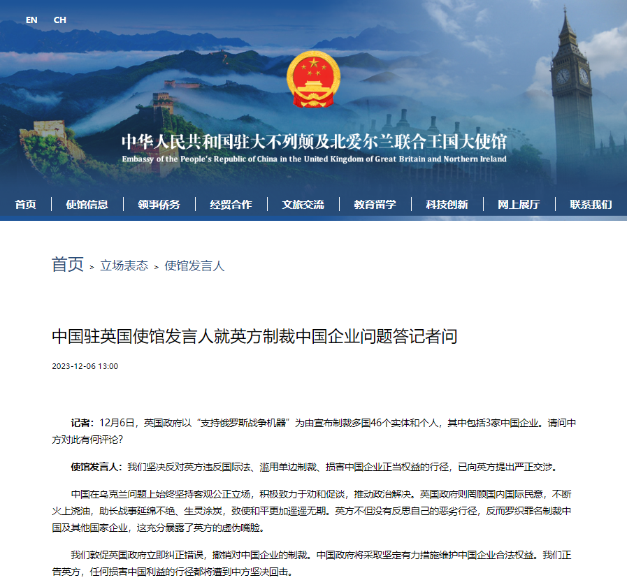 使馆发言人:我们坚决反对英方违反国际法、滥用单边制裁、损害中国企业正当权益的行径,已向英方提出严正交涉。