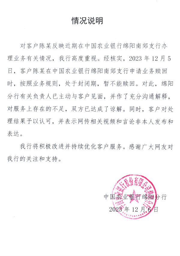 12月5日,一女子30万存款疑被银行转成理财,因取不出钱坐地痛哭,引起广泛关注。12月6日,中国农业银行绵阳分行发布情况说明称,经核实,12月5日,客户陈某在中国农业银行绵阳南郊支行申请业务赎回时,按照业务规则,处于封闭期,暂不能赎回。对此,绵阳分行有关负责人已主动与客户见面,并作了充分沟通解释,对服务上存在的不足,双方已达成了谅解。同时,客户对处理结果予以认可,并表示网传相关视频和言论非本人发布和表达。