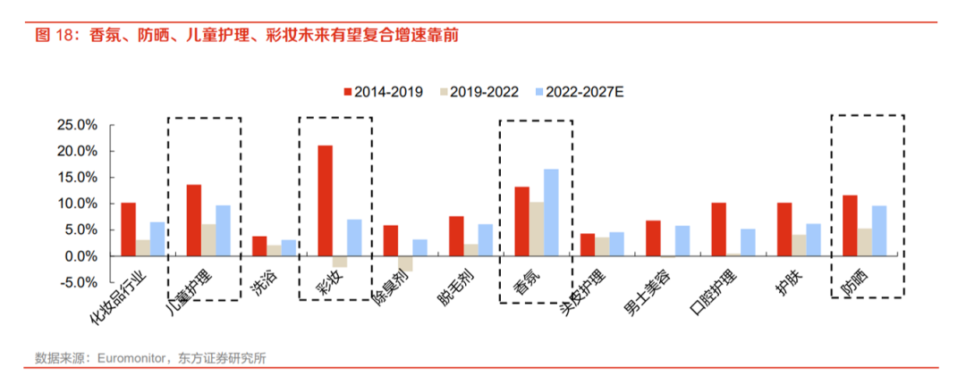 据东方证券研报,2022年-2027年,化妆品行业复合增速靠前的四大细分赛道分别是香氛、儿童护理、防晒、彩妆。
