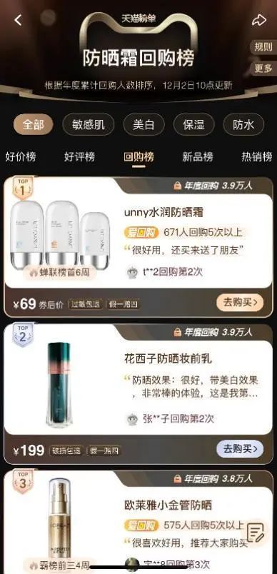 而Mistine蜜丝婷2023版小黄帽防晒乳已采用“光生物学”防晒系统;截至2023年11月26日,天猫防晒霜回购榜位列第一的unny悠宜水润防晒霜,通过Triple UV protect技术、生物防晒DEFENSIL技术实现物化生三合一防护,其年度累计回购人数达3.9万人。