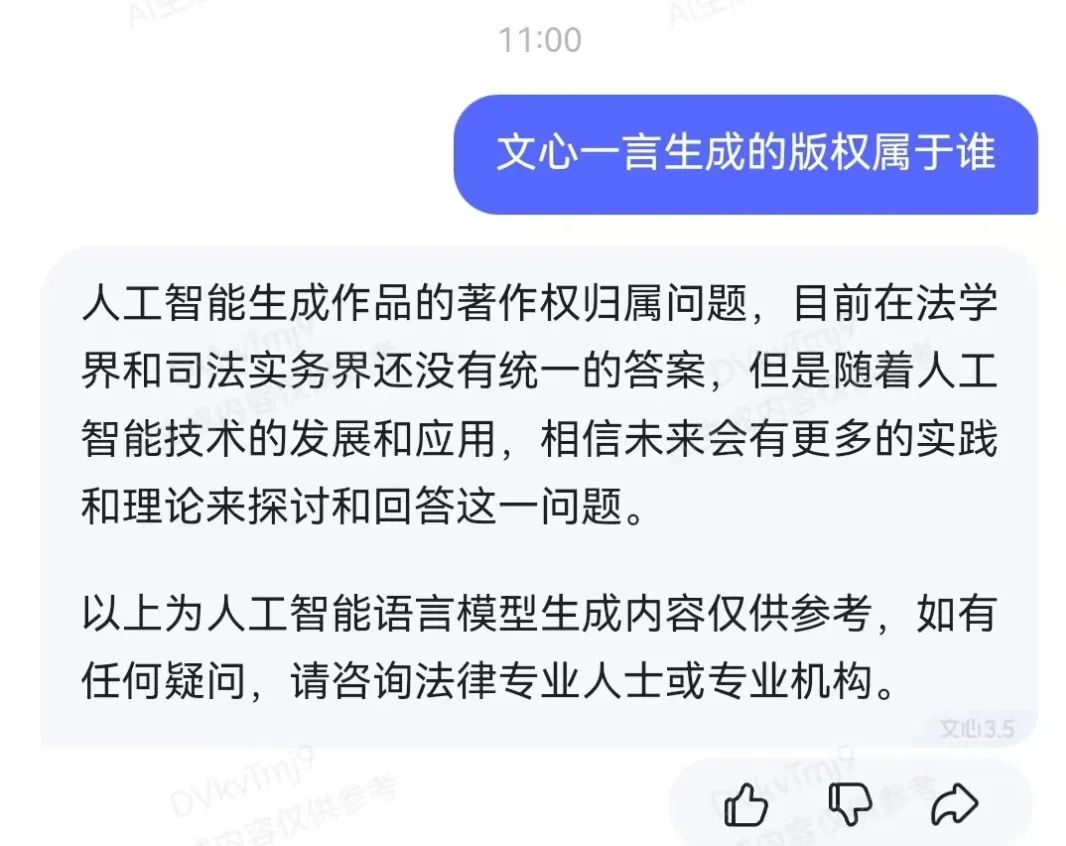 文心一言的回答展现出“太极风”,“目前在法学界和司法还没有统一答案,建议咨询法律专业人士。”商汤SenseChat也是如此,称“版权取决于用户与商汤之间的具体协议或使用条款。”