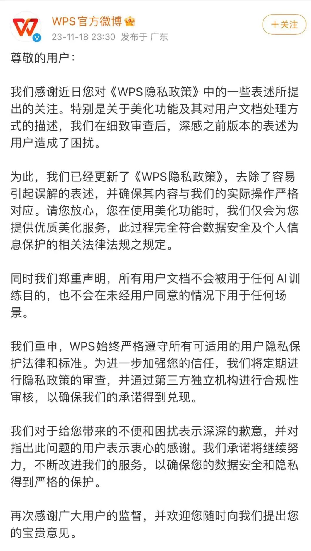 就在AI生成图片著作权侵权第一案一审结果披露的前几天,11月18日深夜,WPS致歉声明引发关注。