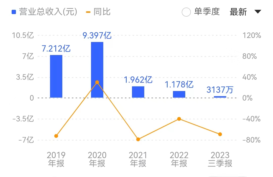 今年前三季度,公司仅实现营收0.31亿元,同比下降69.40%;归母净利润为-4874万元。截至三季度末,公司每股净资产为-0.06元,说明公司资产已不足以覆盖其负债。