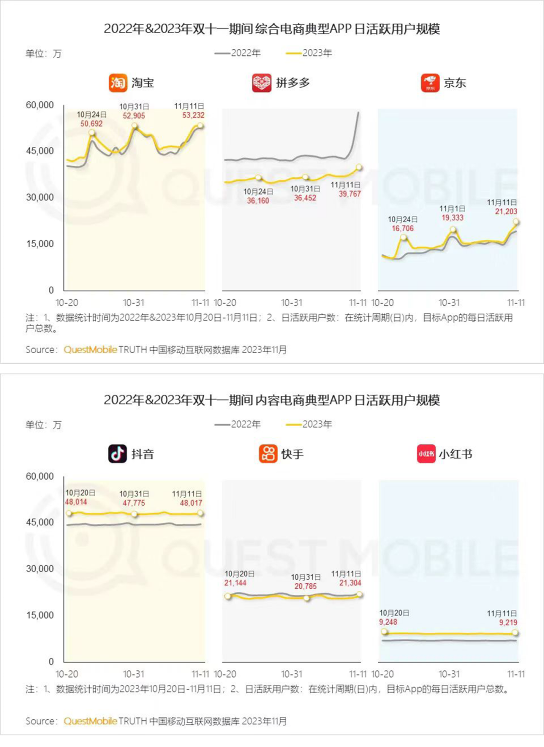 据第三方数据平台QuestMobile,淘宝在今年双11大促期间的日活跃用户在4.5亿量级,波峰突破5.2亿量级,紧随其后的是抖音,在4.7亿量级。