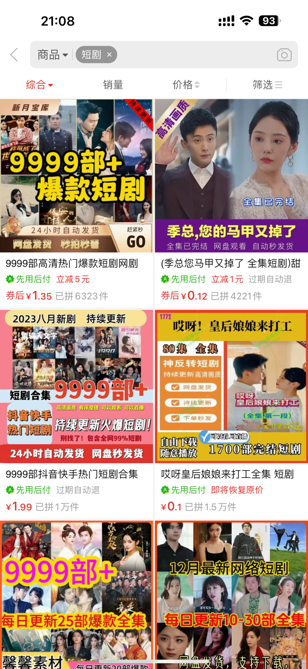 在淘天、拼多多、京东等货架电商平台上,微短剧有两种存在形式,其一为商品。就像购买网络小说的电子版一样,搜索短剧,都可以买到下载资源。