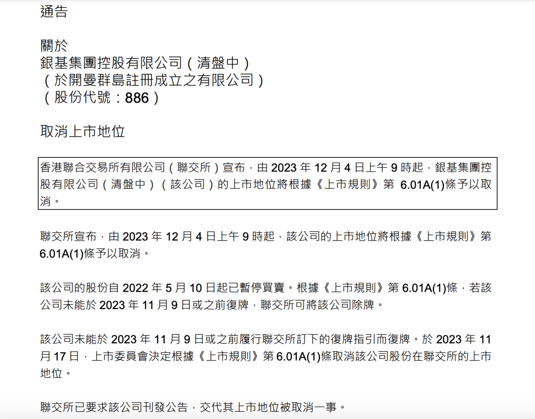 11月29日,香港交易所发公告称,12月4日上午9时起,取消银基集团的上市地位。