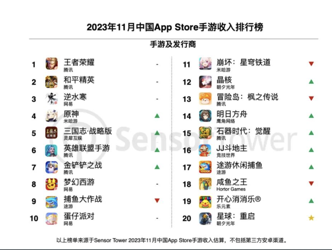 在2023年11月中国App Store手游收入排行榜方面,腾讯旗下的《王者荣耀》《和平精英》和网易旗下的《逆水寒》分别位居前3位。